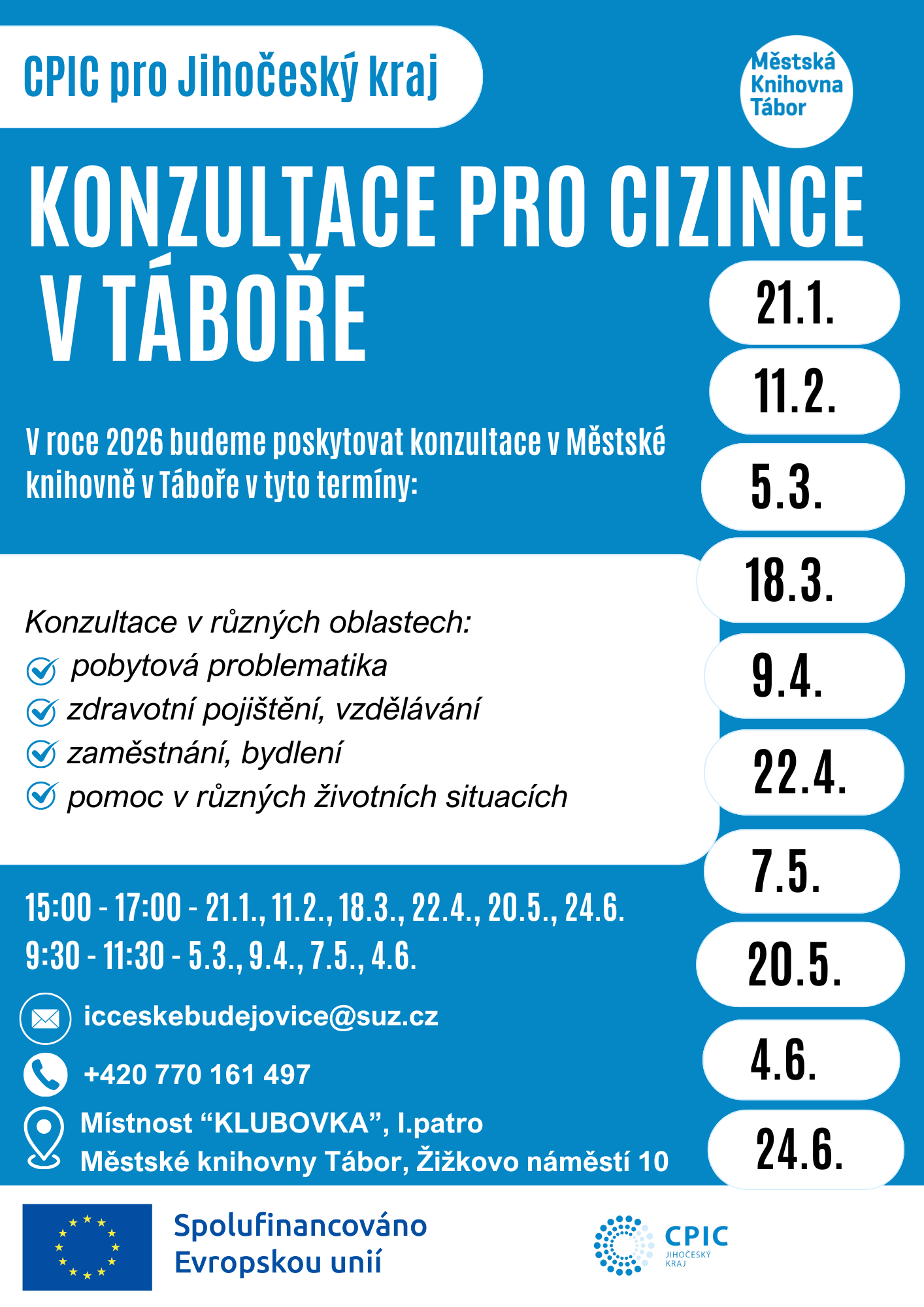 Všechny kurzy probíhají v Městské knihovně Tábor, Žižkovo náměstí 10, Klubovka, 1. patro.